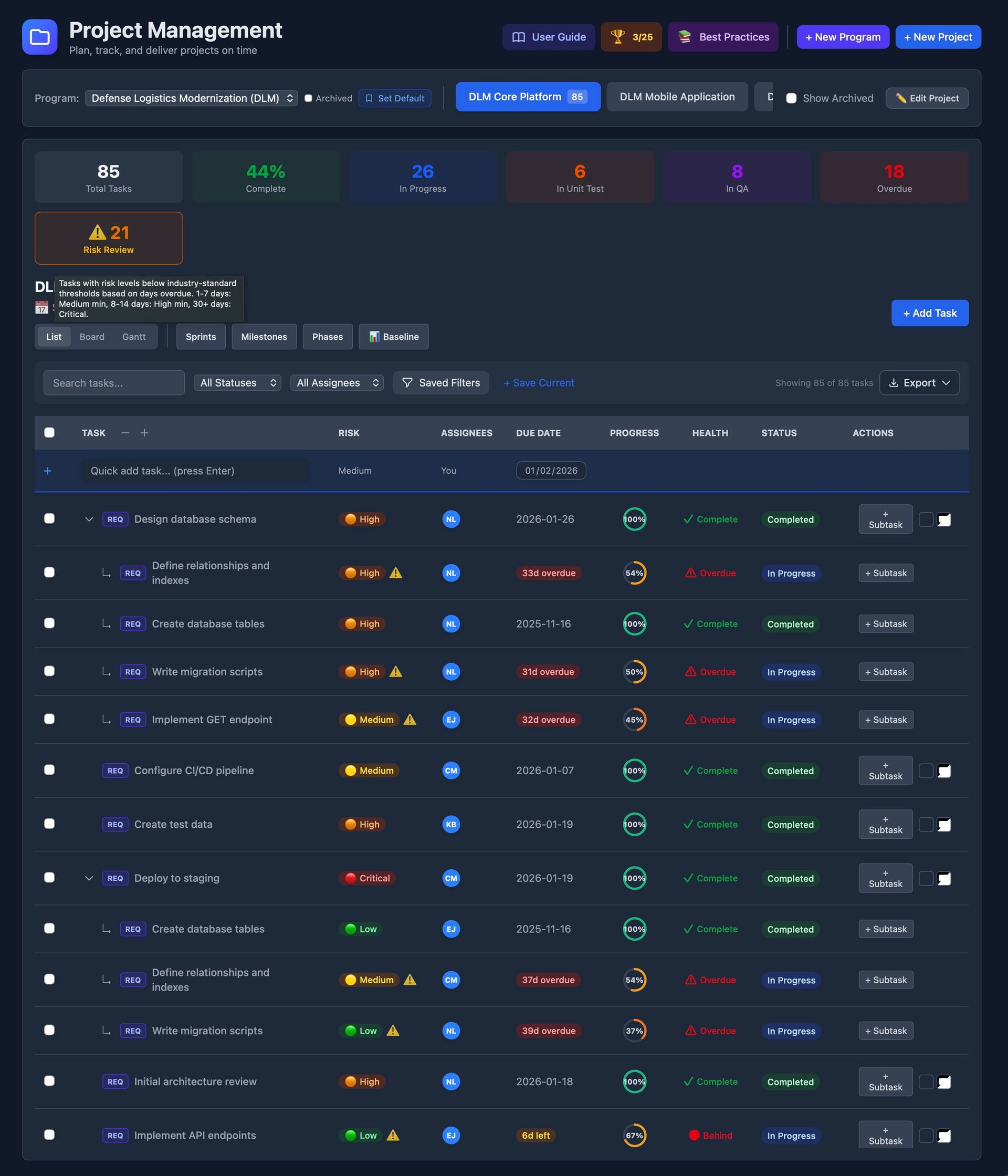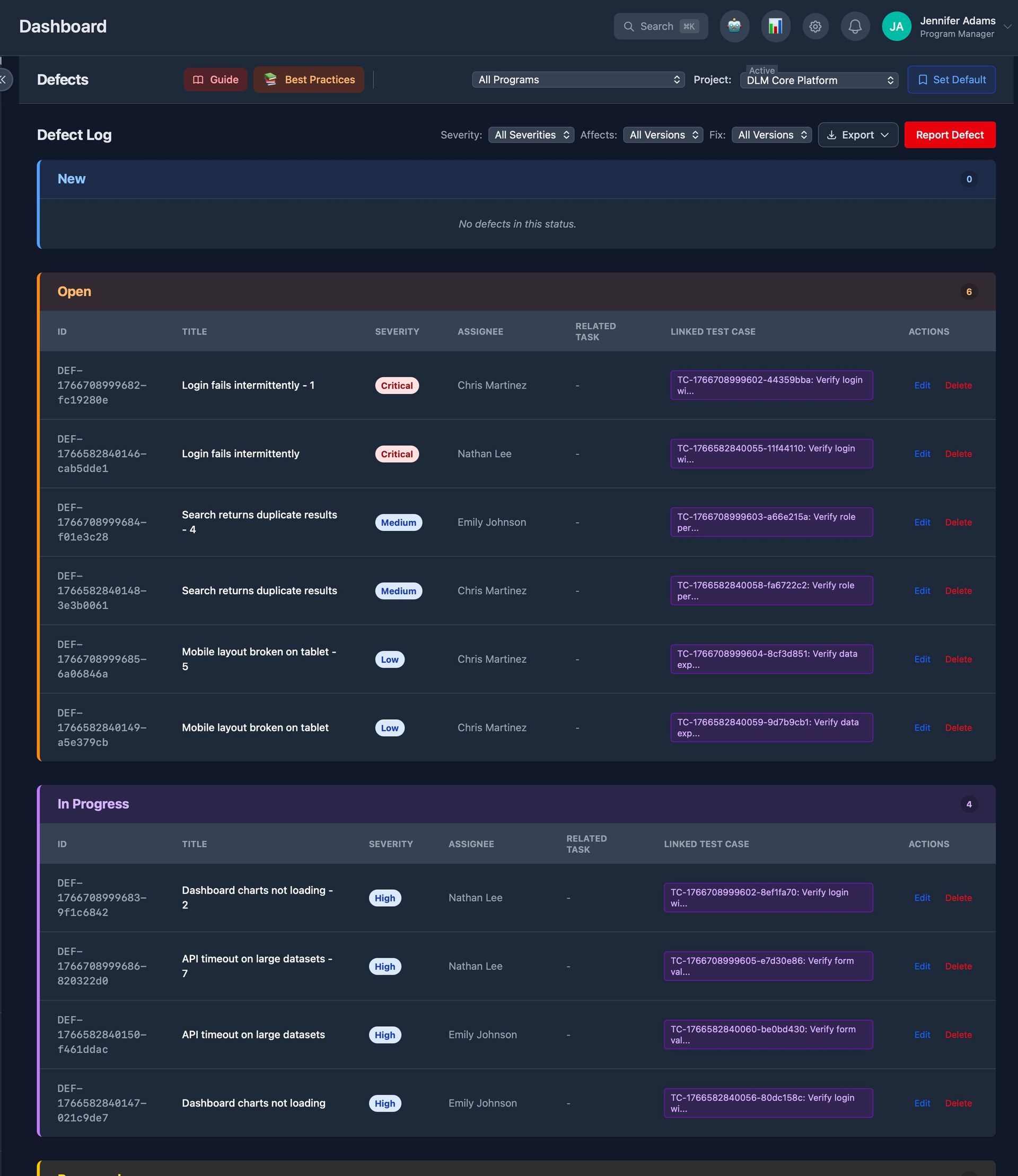 On the commercial side, TMFPRETTY develops CARUSO, a unified program and project execution platform that brings project management, requirements, and quality assurance into one integrated system. CARUSO is designed for teams that want strong delivery discipline without the complexity and cost of stitching multiple tools together. It connects programs and projects to tasking, dependencies, milestones, and approvals, while linking requirements directly to QA test cases, test runs, defects, coverage, and release signoff. The result is clearer visibility, better coordination, and stronger release confidence, supported by built in reporting that does not require complicated queries.